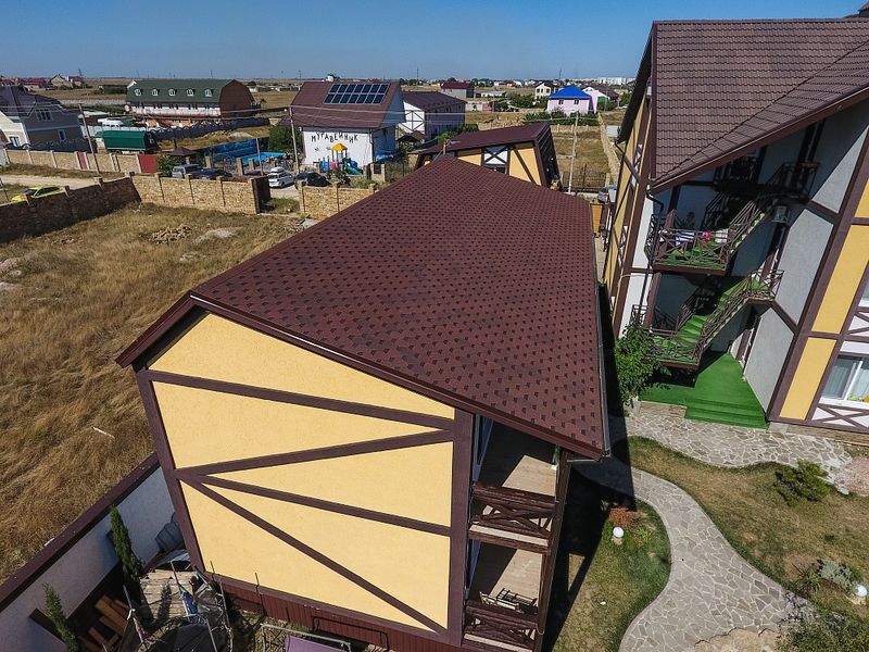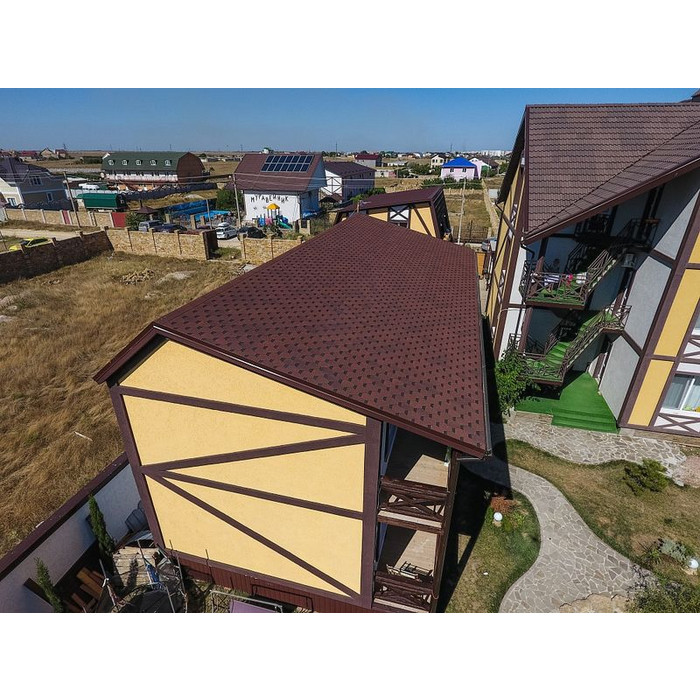 Красный цвет – воплощение благополучия. Он придаст выразительность даже кровлям простой формы с минимумом изгибов и других архитектурных деталей. Красная гибкая черепица особенно эффекта в комбинации с бежевым или светло-серым сайдингом.
