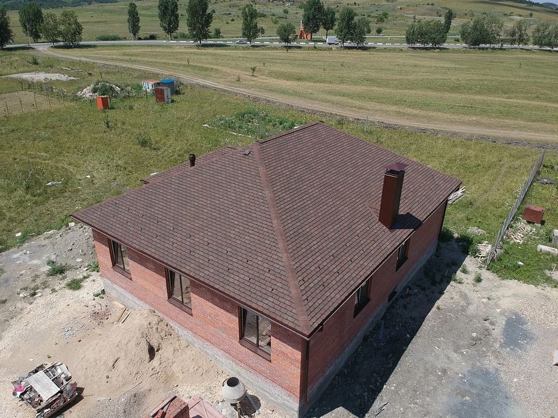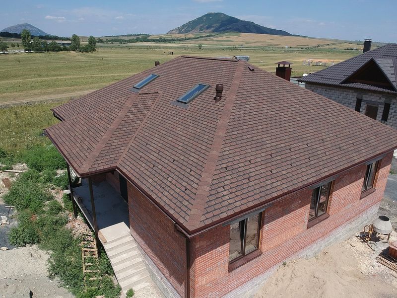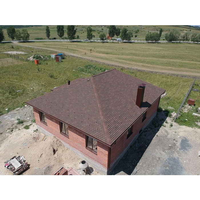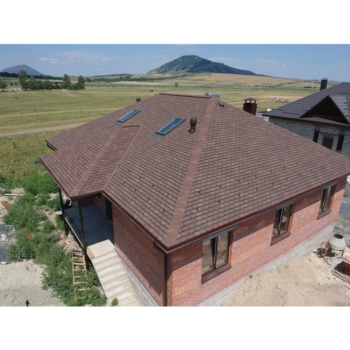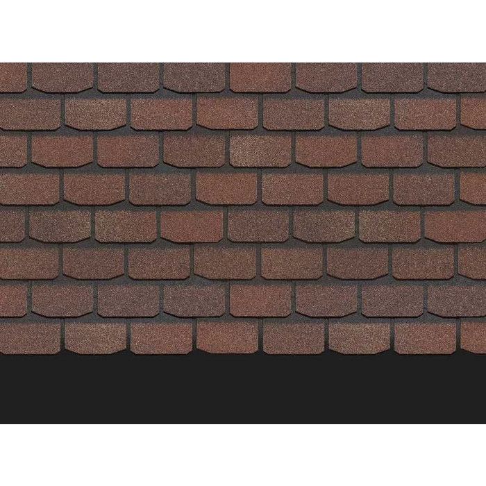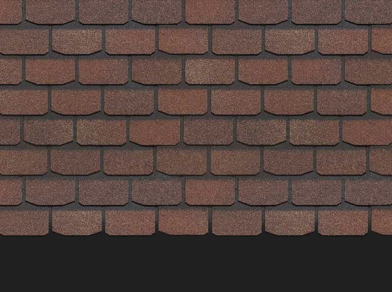 Черепица выполнена в натуральных красно-коричневых оттенках. Красоту дизайна подчеркивает мягкий переход цвета, трехмерный эффект тени, лаконичная форма лепестков гонтов. Кровля хорошо смотрится с сайдингом в нейтральных бежевых тонах, фасадными панелями под камень и кирпичную кладку.