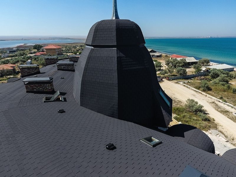 Гонты глубокого серого цвета с лепестками традиционной формы отлично подходят для оформления крыш сложной конфигурации. Черепица подчеркивает красоту деталей, при этом делает кровлю визуально более компактной. Она идеально сочетается с нейтральными светлыми оттенками и фасадами более насыщенных тонов.