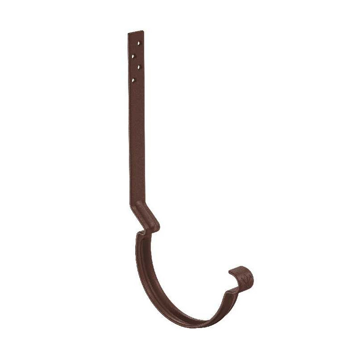 Поставляется с комплектом креплений. Конструкция крюка имеет более вытянутое и глубокое ребро жесткости, поэтому крюк выдерживает повышенные силовые нагрузки. Передний замок крюка фиксирует завиток желоба снаружи, и благодаря этому желоб удобно монтировать даже после установки фартука-капельника. Задний замок имеет конструкцию, исключающую смещение желоба под нагрузкой. Отверстия под крепеж выполнены с зенковкой под шляпку в потай. На передней части крюка расположен фирменный штамп - лилия.