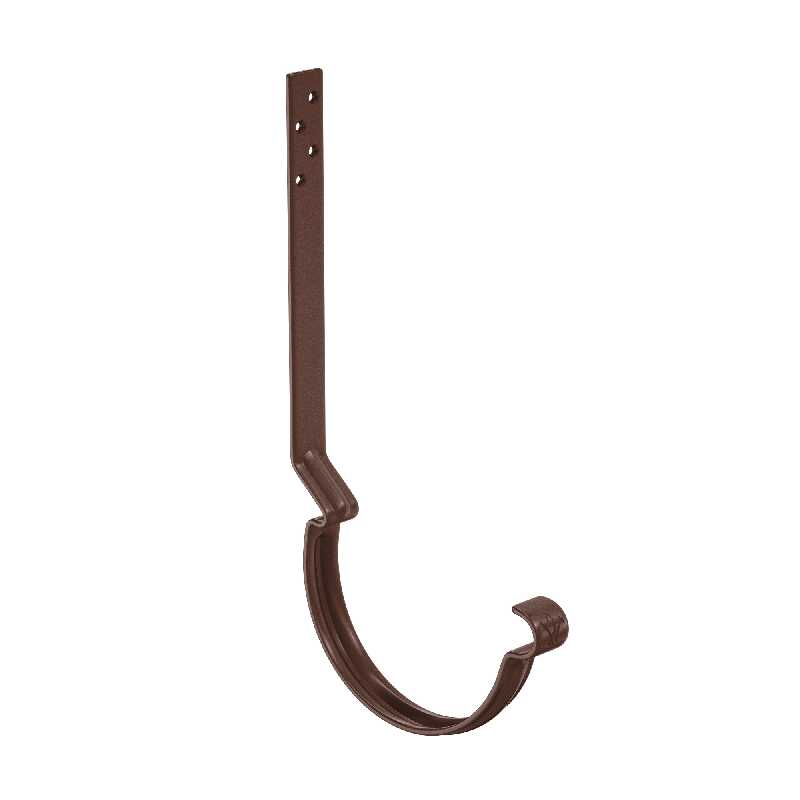 Поставляется с комплектом креплений. Конструкция крюка имеет более вытянутое и глубокое ребро жесткости, поэтому крюк выдерживает повышенные силовые нагрузки. Передний замок крюка фиксирует завиток желоба снаружи, и благодаря этому желоб удобно монтировать даже после установки фартука-капельника. Задний замок имеет конструкцию, исключающую смещение желоба под нагрузкой. Отверстия под крепеж выполнены с зенковкой под шляпку в потай. На передней части крюка расположен фирменный штамп - лилия.