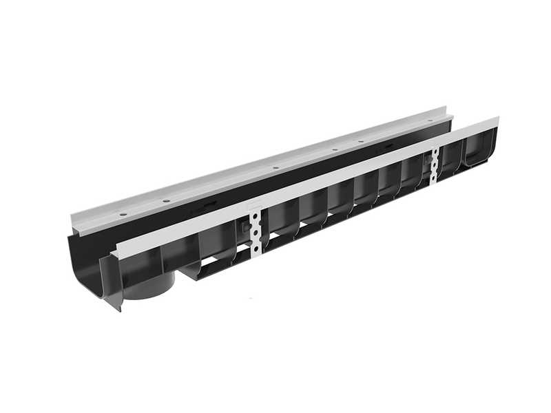 Лоток дополнительно комплектуется заглушками и водоприемной решеткой из стали, чугуна, пластика. Для удержания в неподвижном состоянии решеток изделие имеет пазы по всей длине. Снабжено ребрами жесткости поперечного и продольного направления.