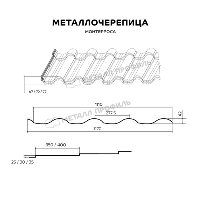 Стальная черепица МОНТЕРРОСА подходит для кровель в классическом и современном стиле. Глубина профиля доходит до 77 мм. Линии профиля скошенные, значит, в зависимости от угла обзора, внешний вид крыши отличается. С данной металлочерепицей крыша станет ещё заметнее. Выбирайте необходимую комбинацию длины (350 либо 400 мм) и высоты (25, 30 и 35 мм) ступеней, чтобы сделать нестандартную крышу, которая акцентирует оригинальность дома. Разработчики улучшили геометрию листа, оптимизировали рабочую площадь. МОНТЕРРОСА обрабатывается покрытиями классов Премьер и Премиум. Украсьте ваш дом эстетичной и выразительной крышей!