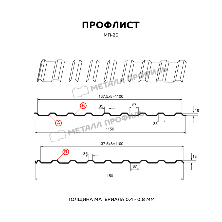 Профлист МП-20 является поистине универсальным стройматериалом. В сравнении с другими модификациями профлиста, он производится в трёх версиях: А, В и R. Разновидности А и В используются для кровельных работ, облицовки фасадов, монтажа ограждений, для внутренней отделки промышленных зданий, гаражей, ангаров и т.п. Профиль МП-20 с маркировкой R отличается присутствием капиллярной канавки и используется в качестве кровельного покрытия. В зависимости от зоны применения, данный профлист выпускается из металлопроката толщиной от 0,4 до 0,8 мм. Обратите внимание: несмотря на цифру 20 в названии, реальная высота этого профиля – 18 мм. Он является материалом бюджетной ценовой категории и имеет доступную стоимость. МП-20 – надёжный и долговечный стройматериал, преимущества которого высоко оценивают не только частные лица, но и крупные застройщики. Он обладает приличной жёсткостью, выдерживает значительные статические нагрузки и эффективно противостоит нагрузкам динамическим.