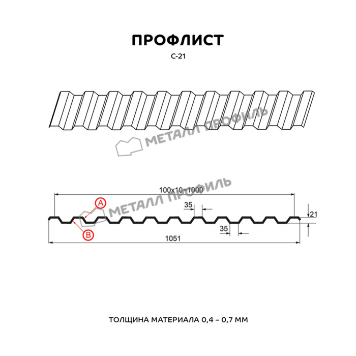 Профнастил с маркировкой С-21 следует понимать, как «стеновой» тип с глубиной профиля 21 мм. На самом деле, С-21 – один из наиболее универсальных стройматериалов, применяемый не только для фасадов. Он будет уместен как для обшивки стен, так и для обустройства кровельного покрытия, установки ограждений. С успехом С-21 находит применение в строительстве торговых павильонов, быстровозводимых зданий, складских помещений, а также в качестве элемента сэндвич-панелей. С-21 отлично подходит в качестве основы для Профилированного листа. Для этого он обладает хорошей несущей способностью. Довольно близко расположенные трапециевидные волны придают ему достаточную жёсткость. А симметричный рисунок гофры, идентичный с обеих сторон, обеспечивает Профилированному листу эстетичный внешний вид. В зависимости от назначения, мы можем выпустить профнастил С-21 с различной толщиной стали от 0,4 до 0,7 мм. Для повышения срока эксплуатации и внешней привлекательности, профилированный лист изготавливается с финишным покрытием различных цветов и фактур, включая покрытия под дерево, камень, кирпич.