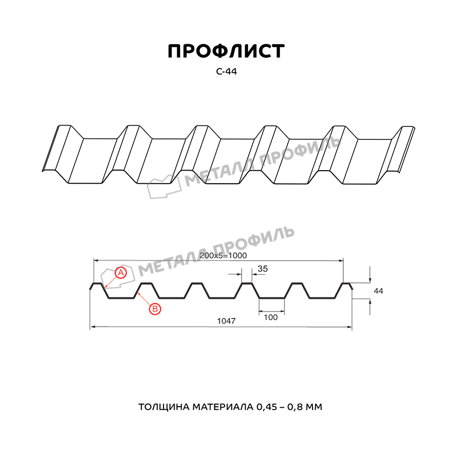 Профнастил С-44 находит применение фактически во всех сферах строительной отрасли. Этот профлист одинаково популярен как в гражданском домостроении, так и на крупномасштабных объектах. Профилированный лист с глубиной трапеции 44 мм отличается очень хорошими несущими показателями. Это самый высокий из профилей с наименованием С – «стеновой». Он пригодится, если вам нужно: соорудить подсобные помещения, установить стены и перегородки в щитовых зданиях, поставить забор, перекрыть кровлю. Также данный прокатный лист| профиль характеризуется достаточной несущей способностью для строительства каркасов зданий и армирующей основы для железобетона. Профнастил С-44 разрешено устанавливать в районах с экстремальными климатическими условиями. Стороны этого профиля асимметричны. Лицевая сторона (А) имеет более ритмичный рисунок из узких вершин и применяется для кровли. Сторона В выглядит более тяжеловесно, подходит для прочих сфер применения.