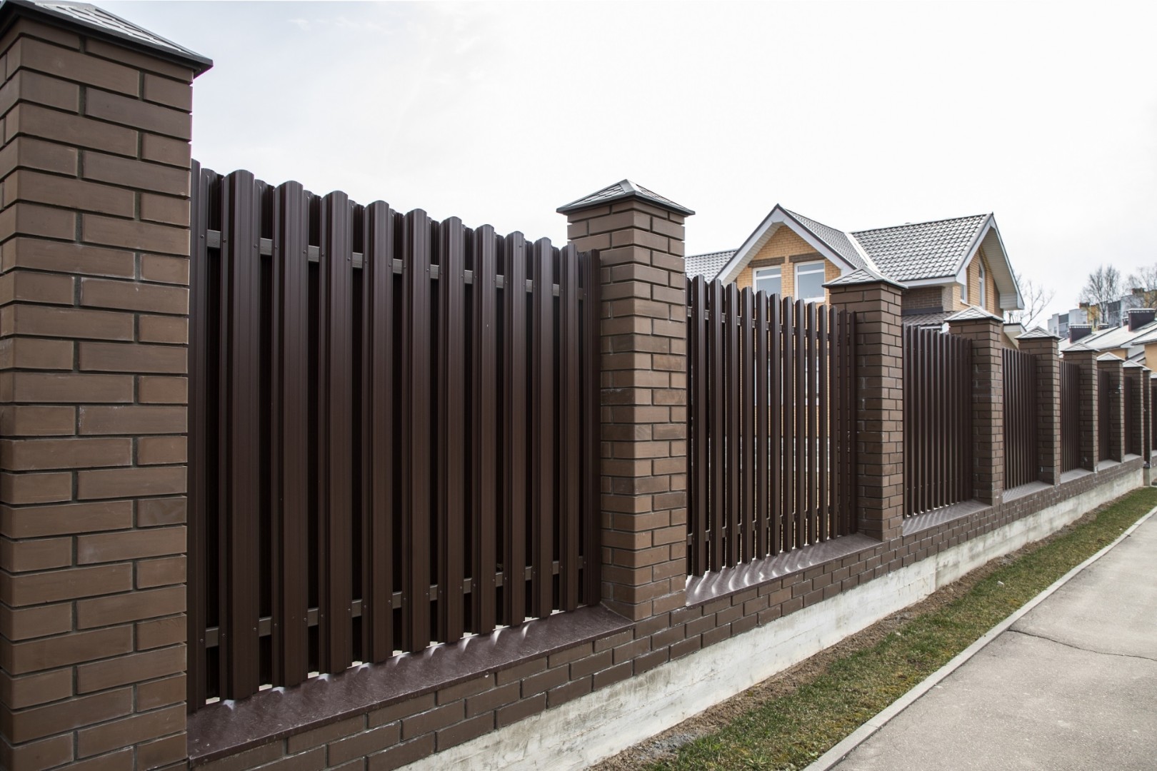 - Штакетник металлический МП TRAPEZE-O 16,5х118 (VikingMP E-20-8017-0.5) похож на ограждение из дерева.