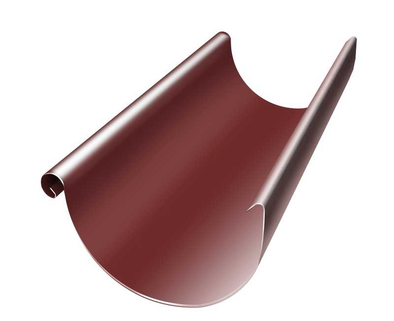 Желоб полукруглый предназначен для сбора дождевой воды с кровли. Желоб фиксируется на крюках, установленных с промежутком 600-900мм и обеспечивающих уклон 5 , мм на погонный метр.